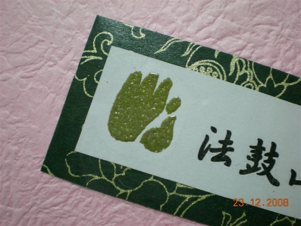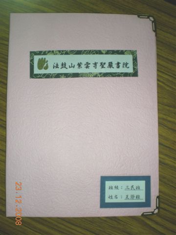 封面的法鼓山山徽,是用我自己刻的橡皮章,用膠水印台加上金粉,處理成燙金的效果,質感還不錯。用電腦印了課程名稱,襯上有中國風的和紙,加上博士膜保護,看起來就帶點莊嚴的感覺^^