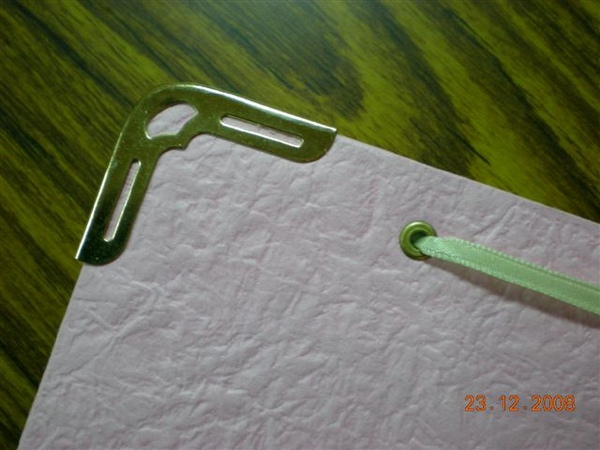 書殼的背面上方釘上銅扣,內頁的作業也一樣打好洞,做成活動式的裝訂,日後有下一期的作業,還可以繼續收納進來。