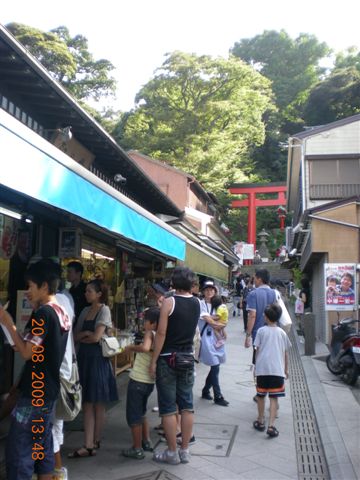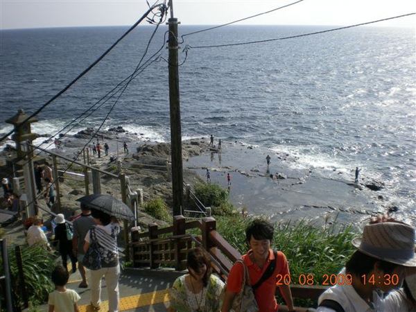 江之島上,沿途的景色有點像台灣的九份加上墾丁的感覺,既是山路又有海邊的景色。除了商店,兩旁還有民宿,看起來像是提供給來衝浪渡過夏日的年輕人住的,有點悠閒又有點觀光味道的奇怪和諧存在這裡。