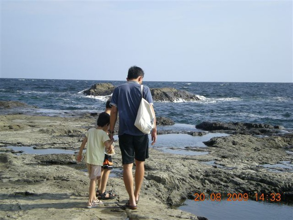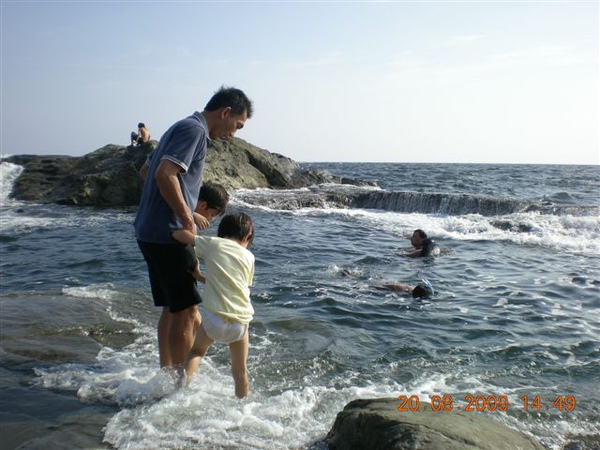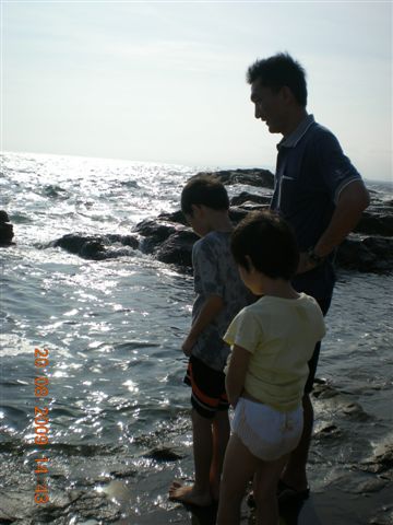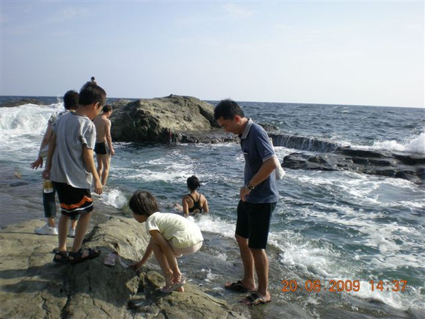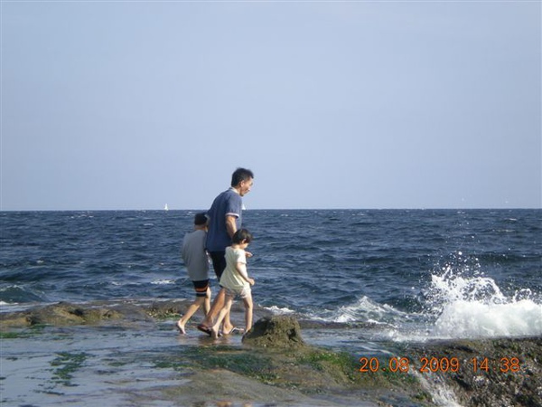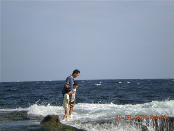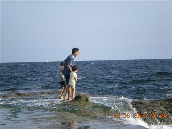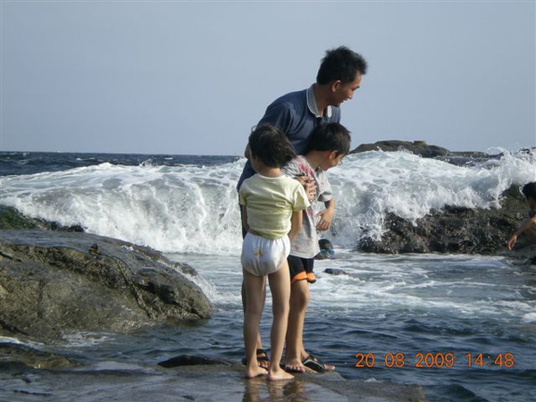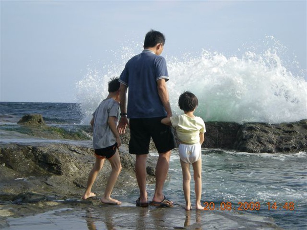 準備打包回家時,我們挑個塊平坦的石頭,一家人坐在石頭上清理腳上的沙子,說時遲那時快,原本還在石頭面下差不多一公尺的海面,一個浪來,突然暴升!水花淹過石面,我趕緊抓住放在石板上的鞋子、背包、小孩們的褲子,顧得了東西沒被沖走,沒顧到大家的屁股都濕掉了!尖叫聲中,頓時我們一家變成周邊遊客們的注目焦點,連我們在內,大家全都笑開了!
