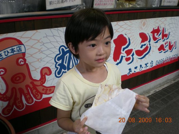 走到山下,也需要補充點體力了,妹吃的這個是章魚餅,好像是用機器將章魚壓扁成紙狀的餅乾,薄薄的一大片。妹說很好吃。